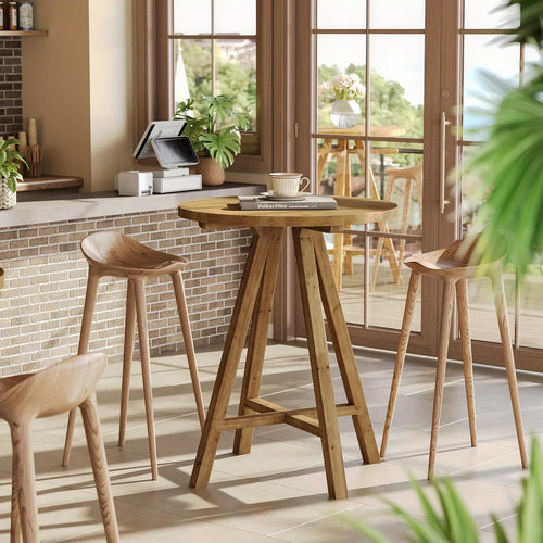Bring warmth and charm to your dining space with this 31.5-inch round counter height table, featuring a natural brown wood finish and classic farmhouse appeal. Designed for two people, its compact size makes it perfect for small kitchens, dining nooks, and apartments. The 35.43-inch height provides comfortable seating for casual meals or drinks. Built with a thickened engineered wood tabletop, four sturdy trapezoidal legs, and a reinforced lower crossbar for added stability and a convenient footrest, this table is durable, space-saving, and ideal for everyday use.